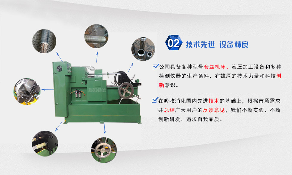 邢臺(tái)市瑞捷機(jī)械制造有限公司專(zhuān)業(yè)生產(chǎn)圓鋼套絲機(jī),鋼管套絲機(jī)兩大系列,其特點(diǎn)主要展現(xiàn)為機(jī)頭的優(yōu)化改進(jìn),大幅度提高了加工螺紋絲頭的精確度和工作效率,有效解決了本行業(yè)在加工絲扣上端部易扭轉(zhuǎn)變形(絲扣加易擴(kuò)口)、配件損耗高、加工效率低的技術(shù)難題。